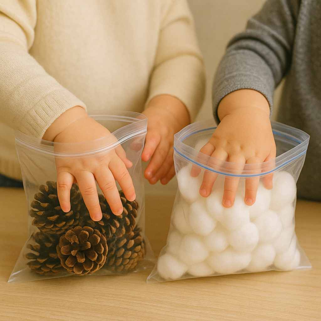 Remplissez le bac avec tous les éléments. Laissez les enfants explorer librement. Ils touchent, sentent, manipulent. Vous pouvez cacher de petits objets de Noël. Les enfants les cherchent dans le bac. Nommez les textures avec eux : doux, rugueux, lisse.