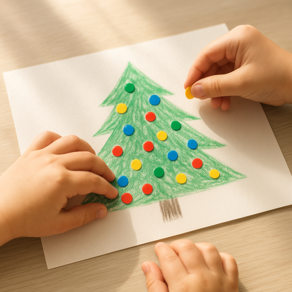 Dessinez un grand sapin sur le papier kraft. Fixez-le au mur à hauteur des enfants. Donnez à chaque enfant une planche de gommettes. Ils collent les gommettes sur le sapin comme des boules de Noël. Dessinez une étoile au sommet. Les plus grands peuvent ajouter des dessins autour. Vous pouvez accrocher aussi une guirlande lumineuse au mur.