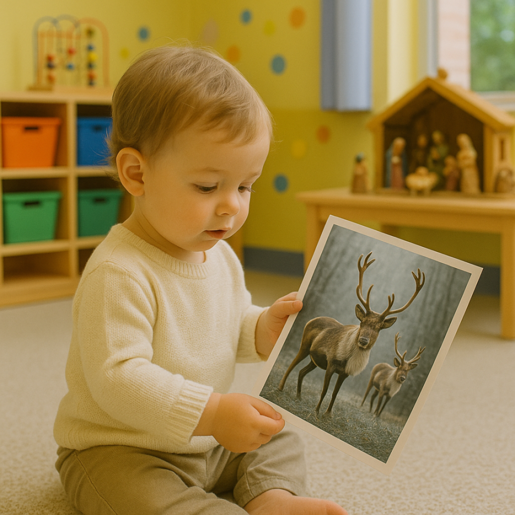 Un jeu d’éveil moteur et cognitif. Les enfants partent à la recherche des rennes cachés dans l’espace. Cette activité stimule l’observation et l’attention. Ici on peut travailler sur la motricité de l’enfant partant à la recherche des rennes.
