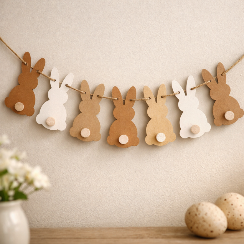 Comment faire : Découpez des silhouettes de lapins dans le carton (les adultes s’en chargent). Les enfants ajoutent une queue en coton pour plus de douceur. On perfore les oreilles, on passe la ficelle pour relier tous les lapins, et on suspend la guirlande sur un mur ou une fenêtre.