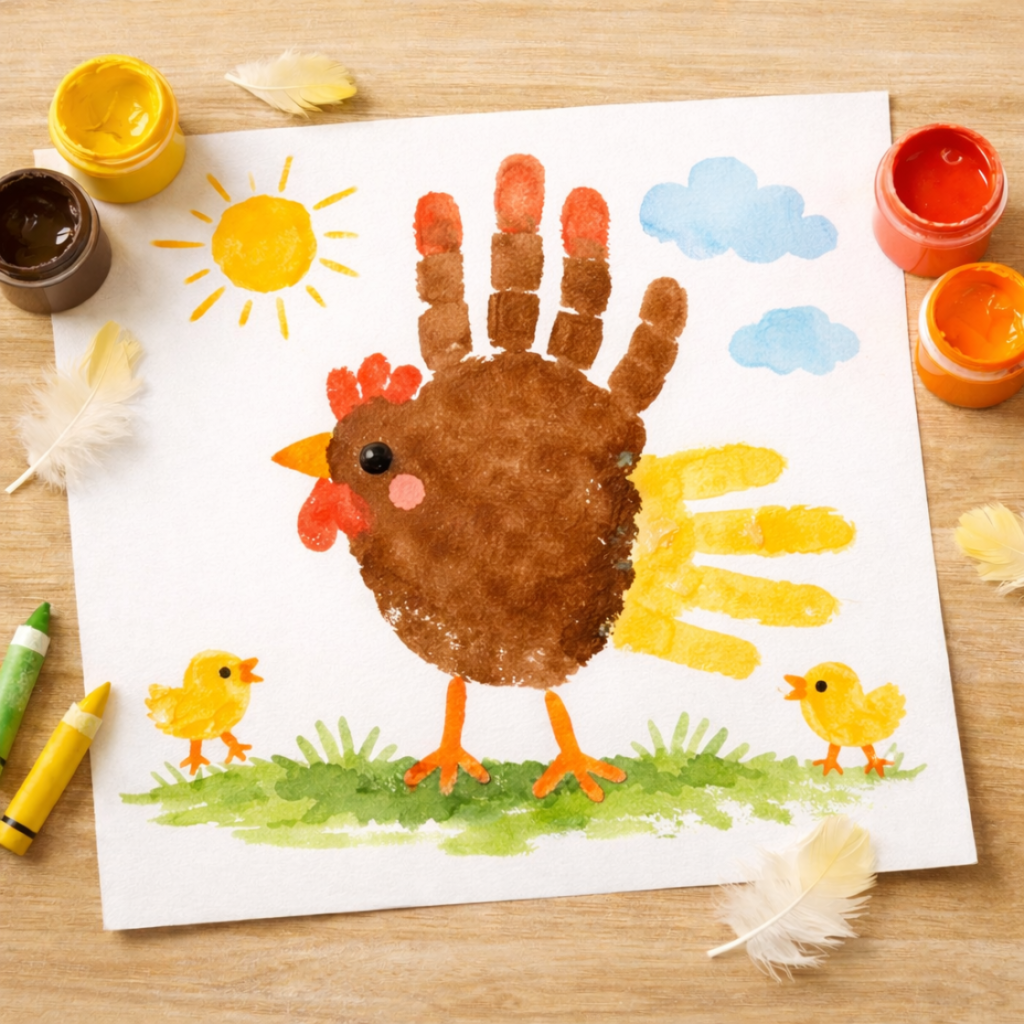 Le projet : Transformer l’empreinte de la main de l’enfant en une adorable poule ou en un poussin.